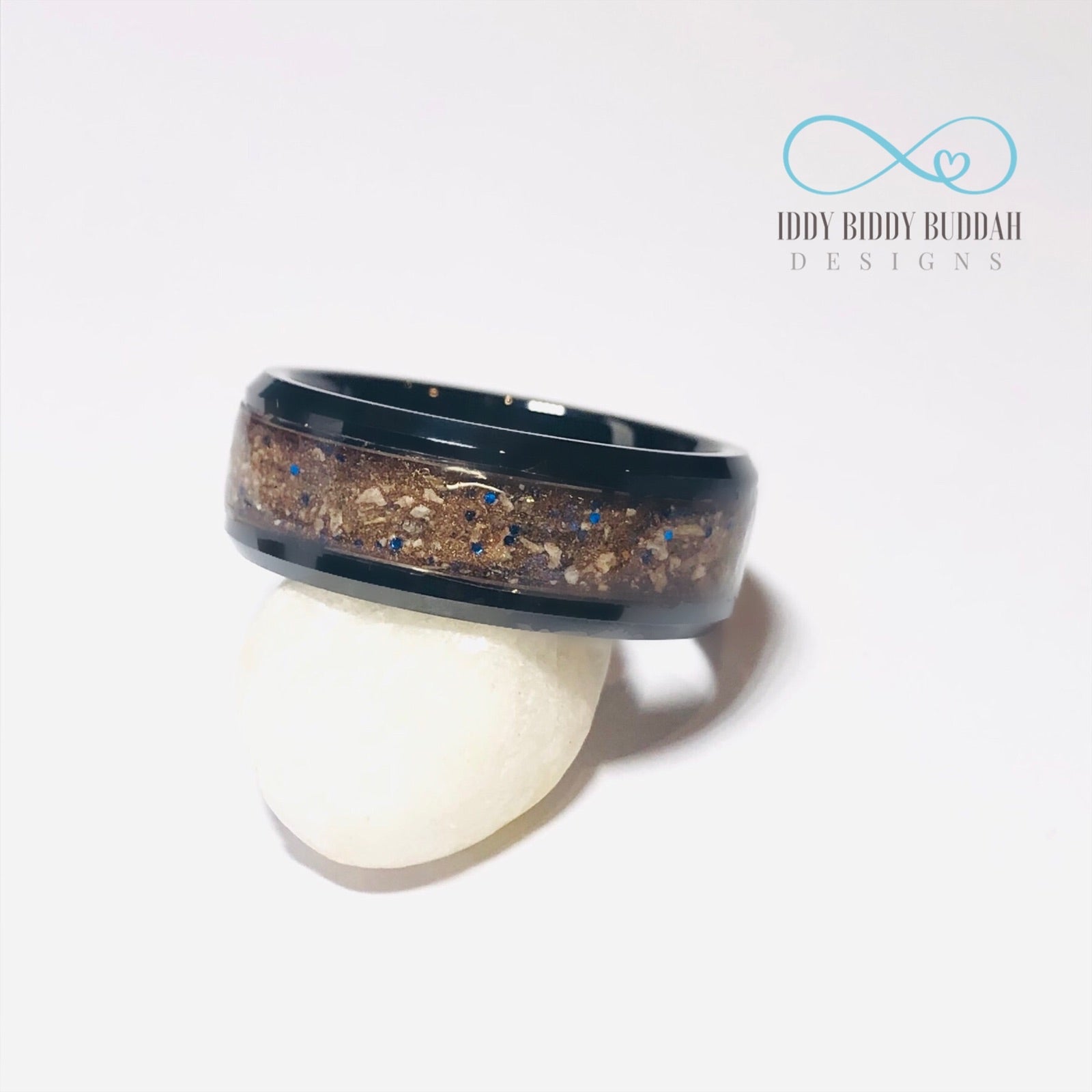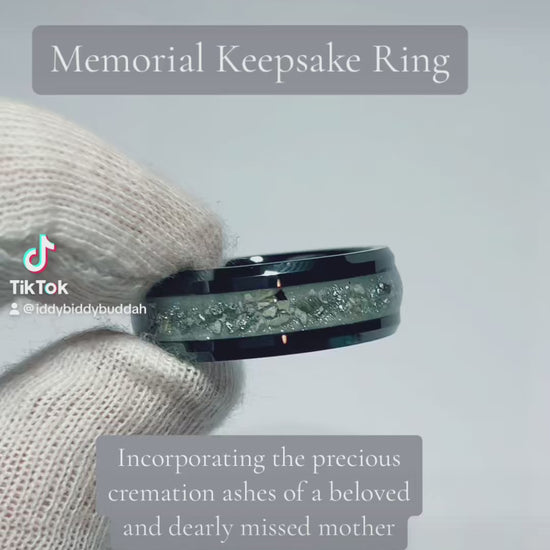 Materials: Black tungsten carbide, black ceramic or stainless steel ring base with DNA inclusions set in resin