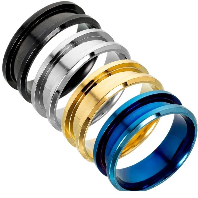 These rings are available in black tungsten carbide, black ceramic or stainless steel in silver tone, gold tone or blue tone.