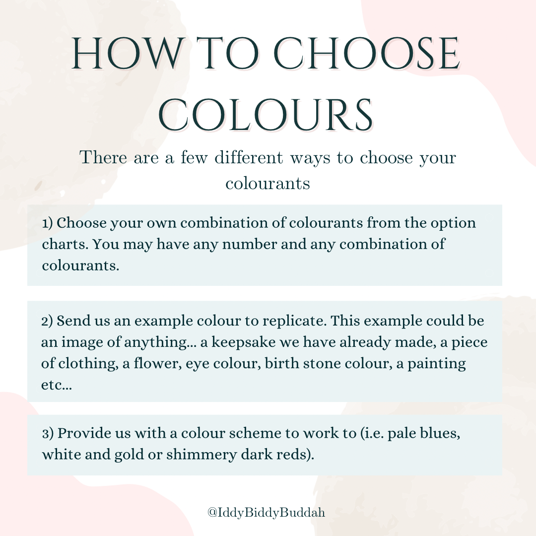 Colours available: resin avaible in any colour. Please refer to our option charts for shimmer, glitter and fleck options.