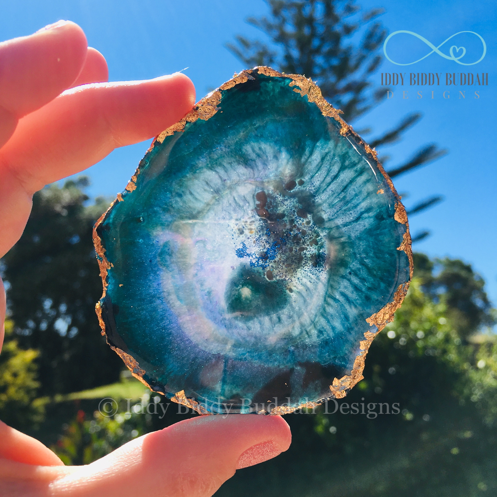 Each replica geode slice is carefully handcrafted, uniquely moulded with multiple resin pours and finished with your choice of metallic leaf edging.