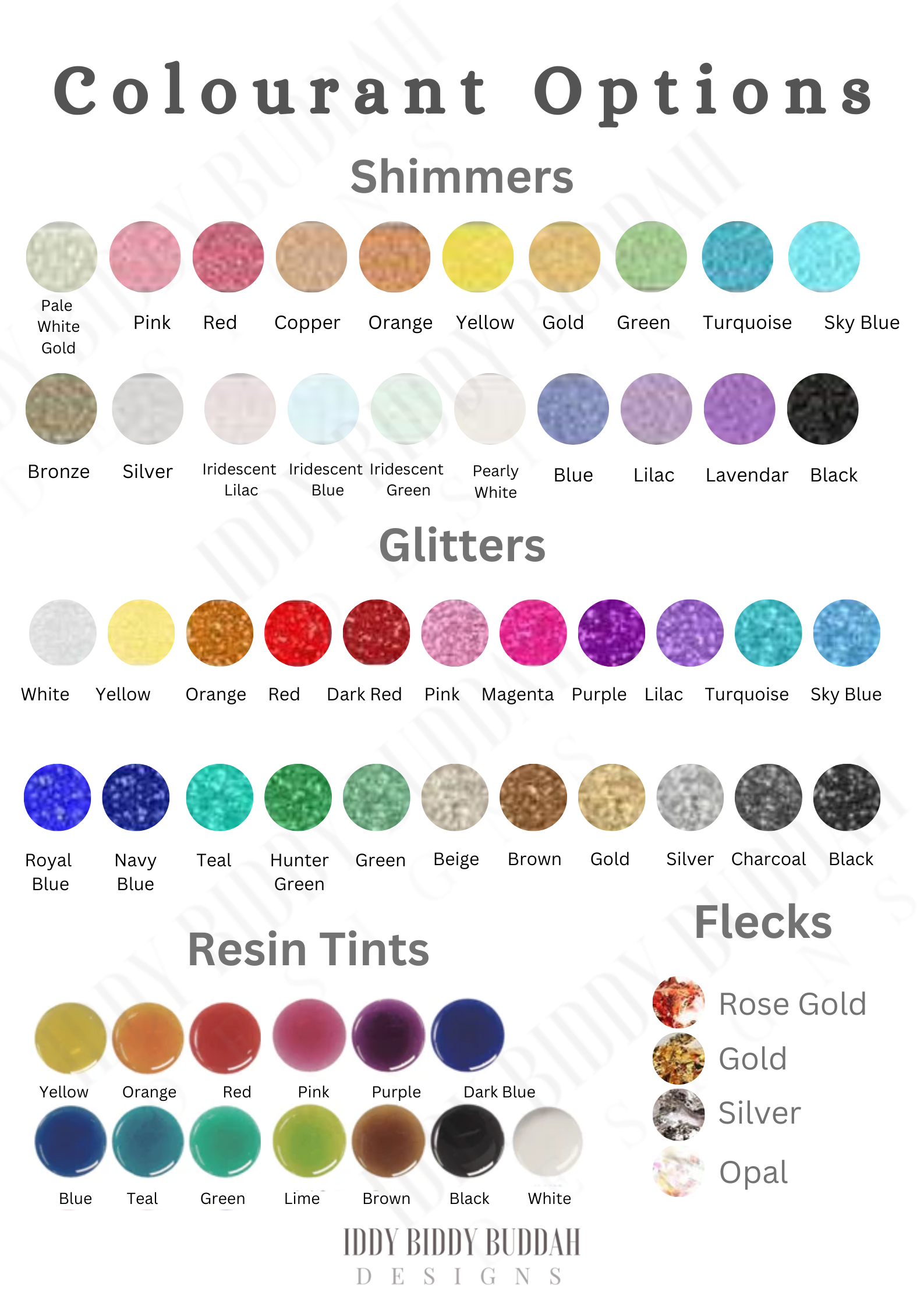 Colours available: resin avaible in any colour. Please refer to our option charts for shimmer, glitter and fleck options.