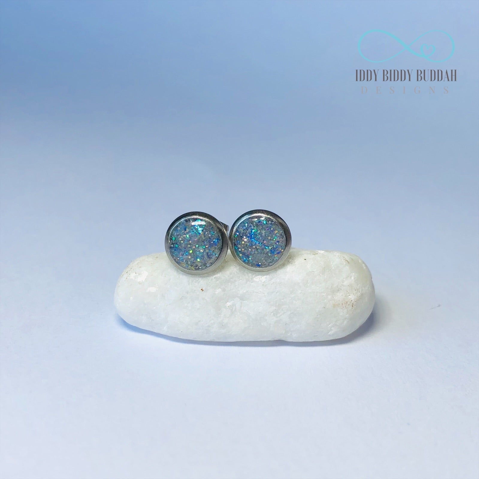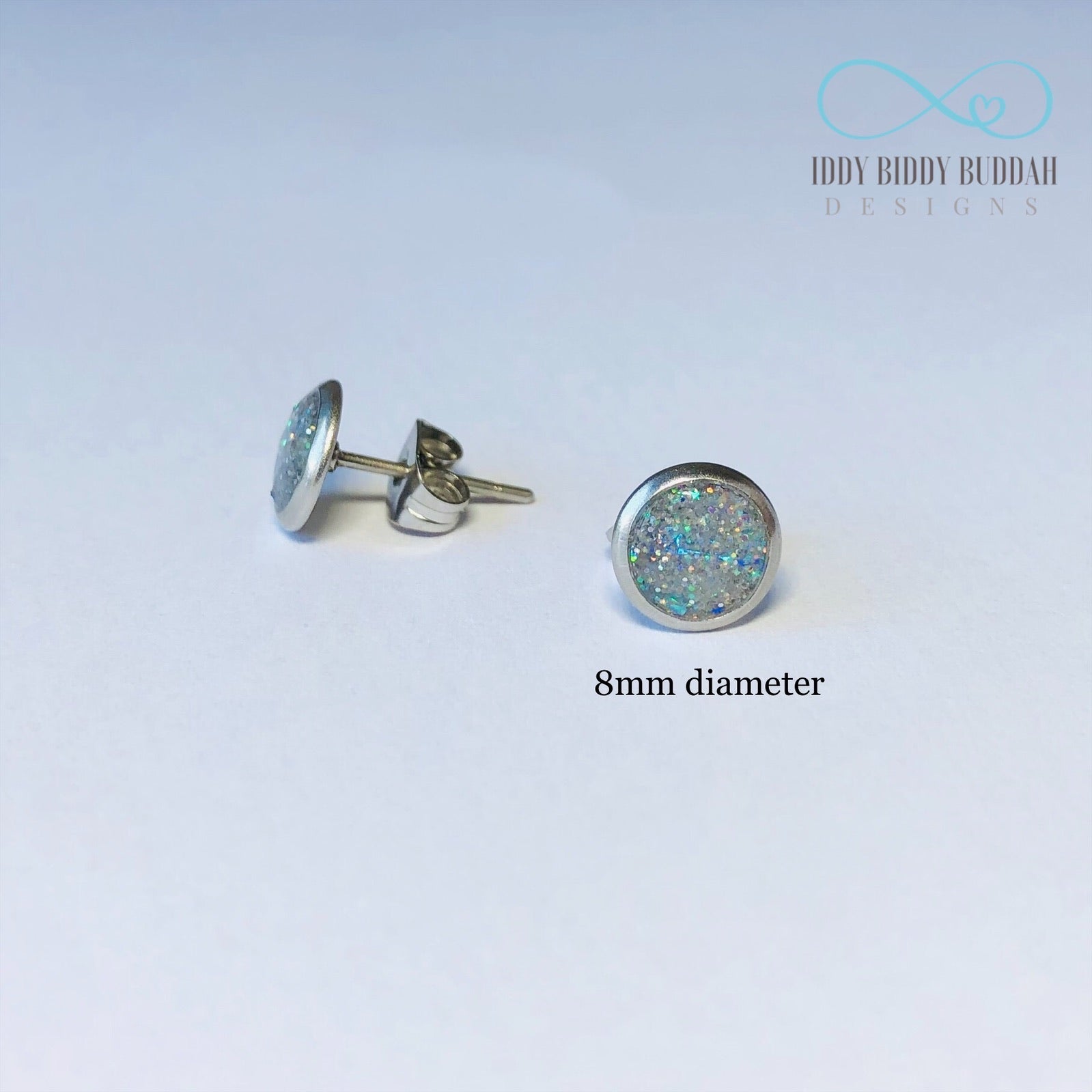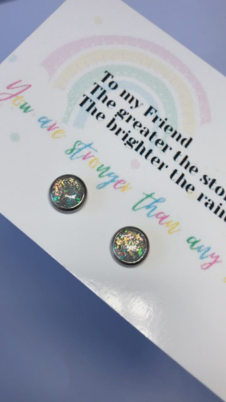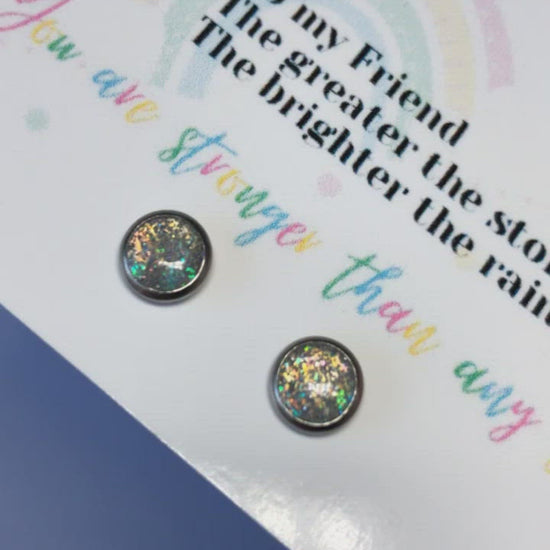 Hypoallergenic steel studs with a combination of rainbow shimmers, glitter and opalescent fleck.